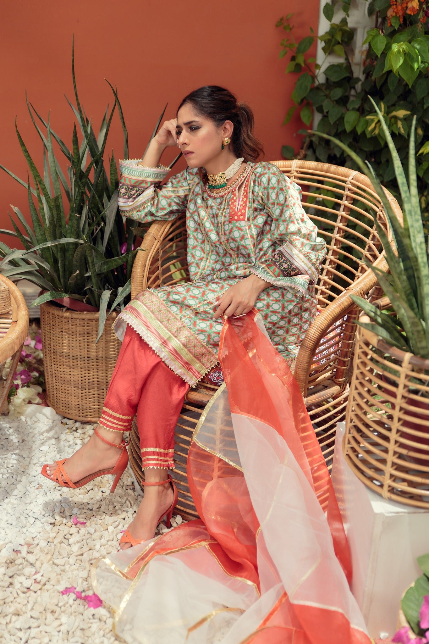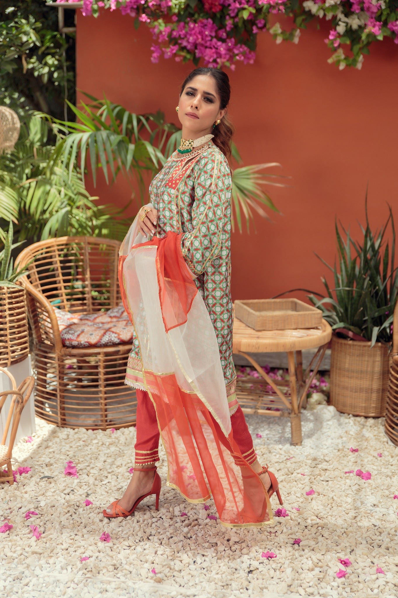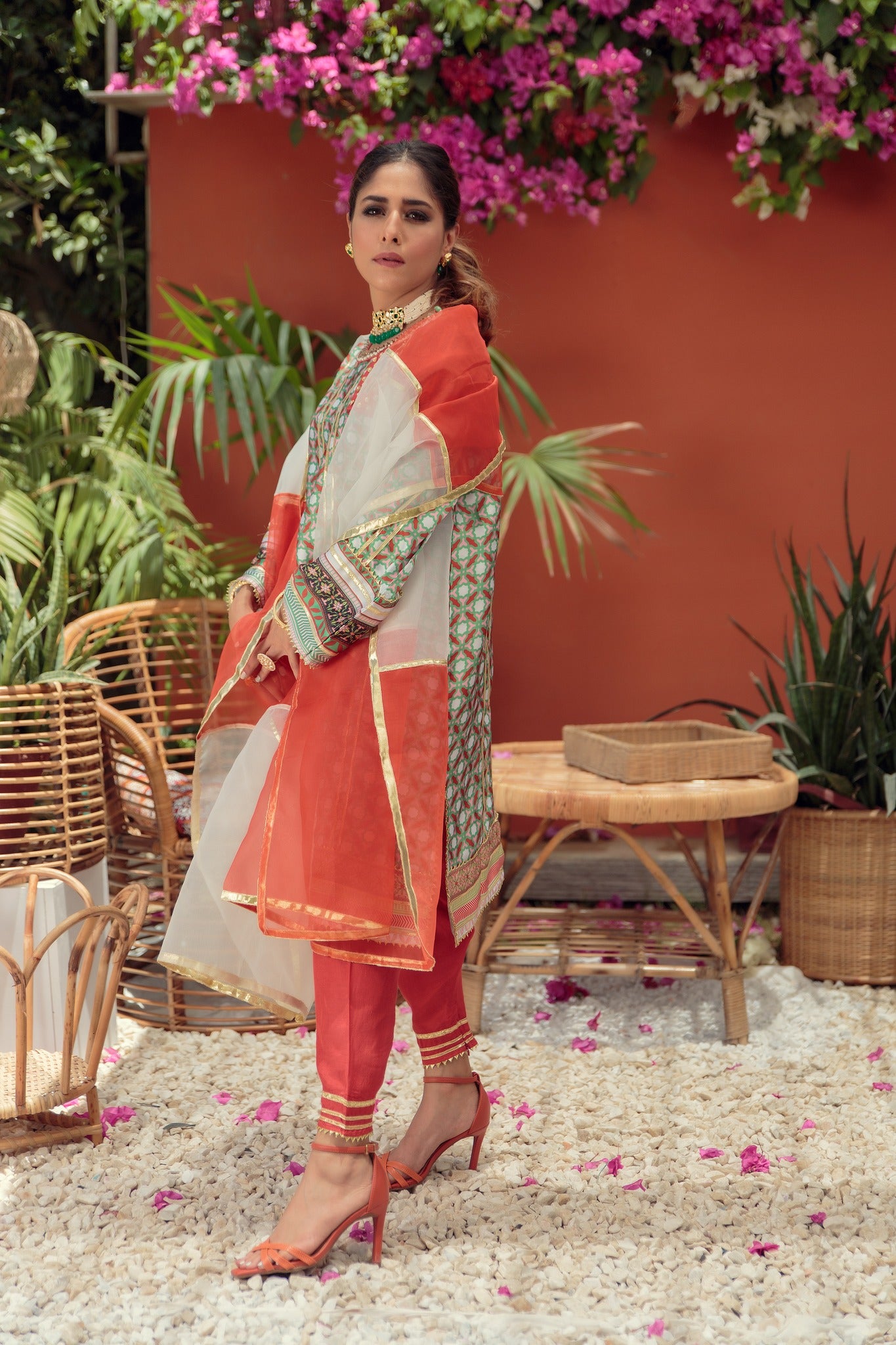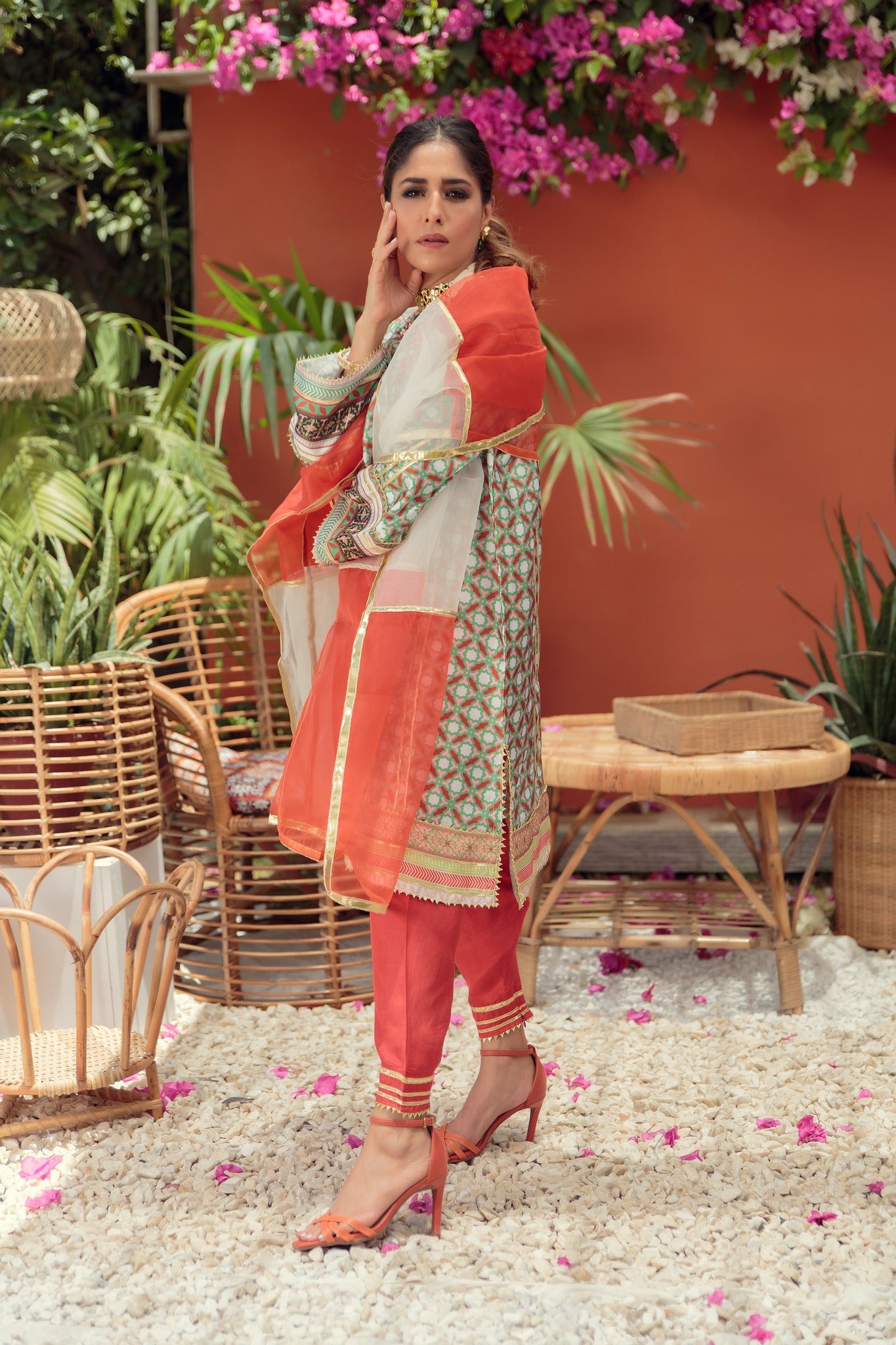 The relaxed, much loved silhouette has a universally flattering neckline, adorned with delicate hand-embroidered neck line. Its paired with a cotton silk shalwar with gota (as pictured) and an organza dupatta to effortlessly steal the show.