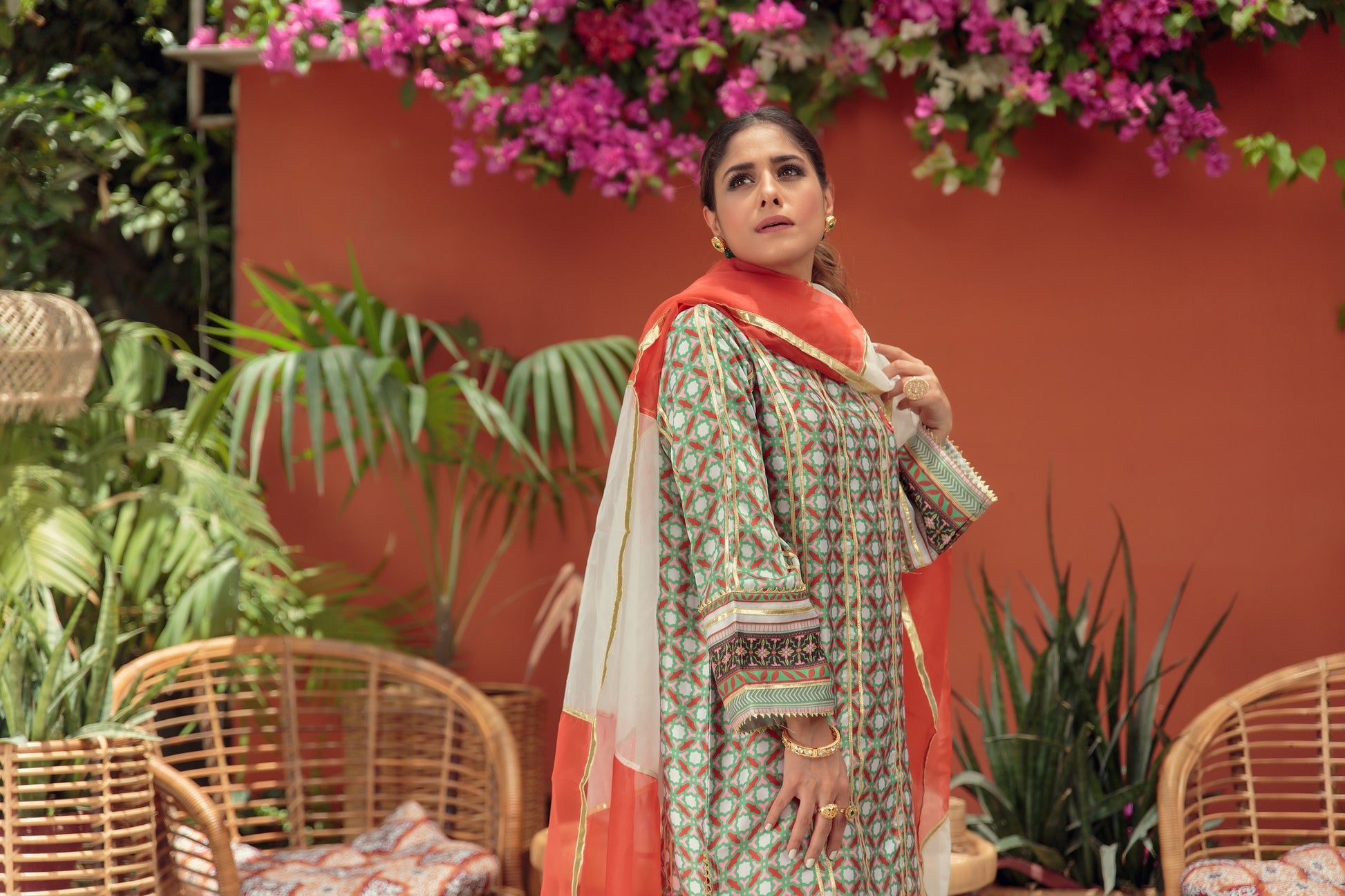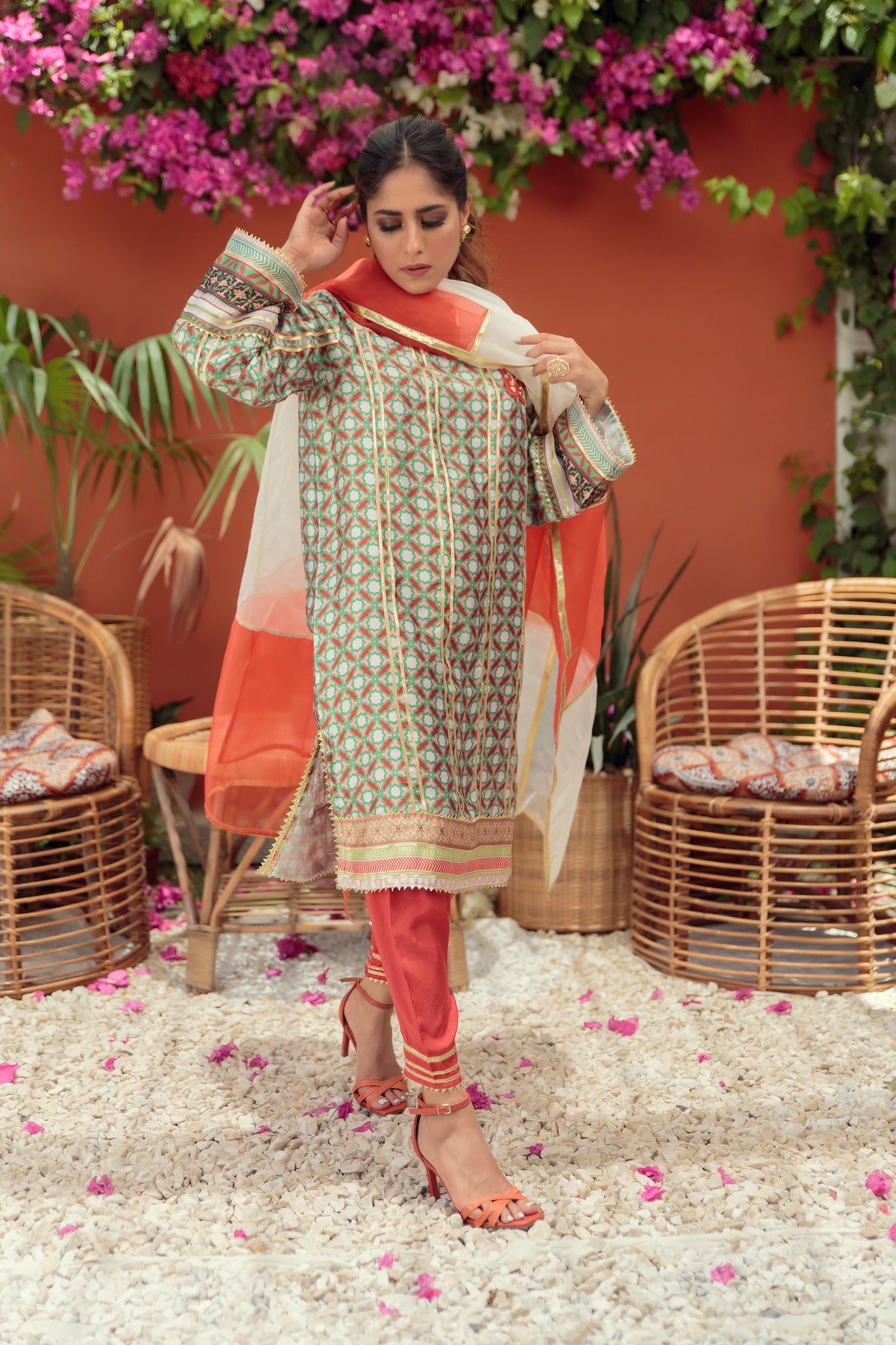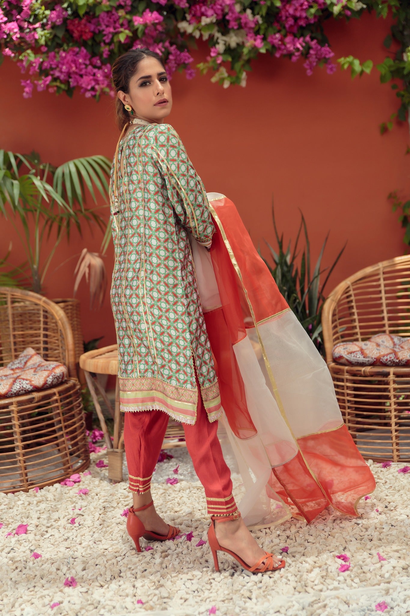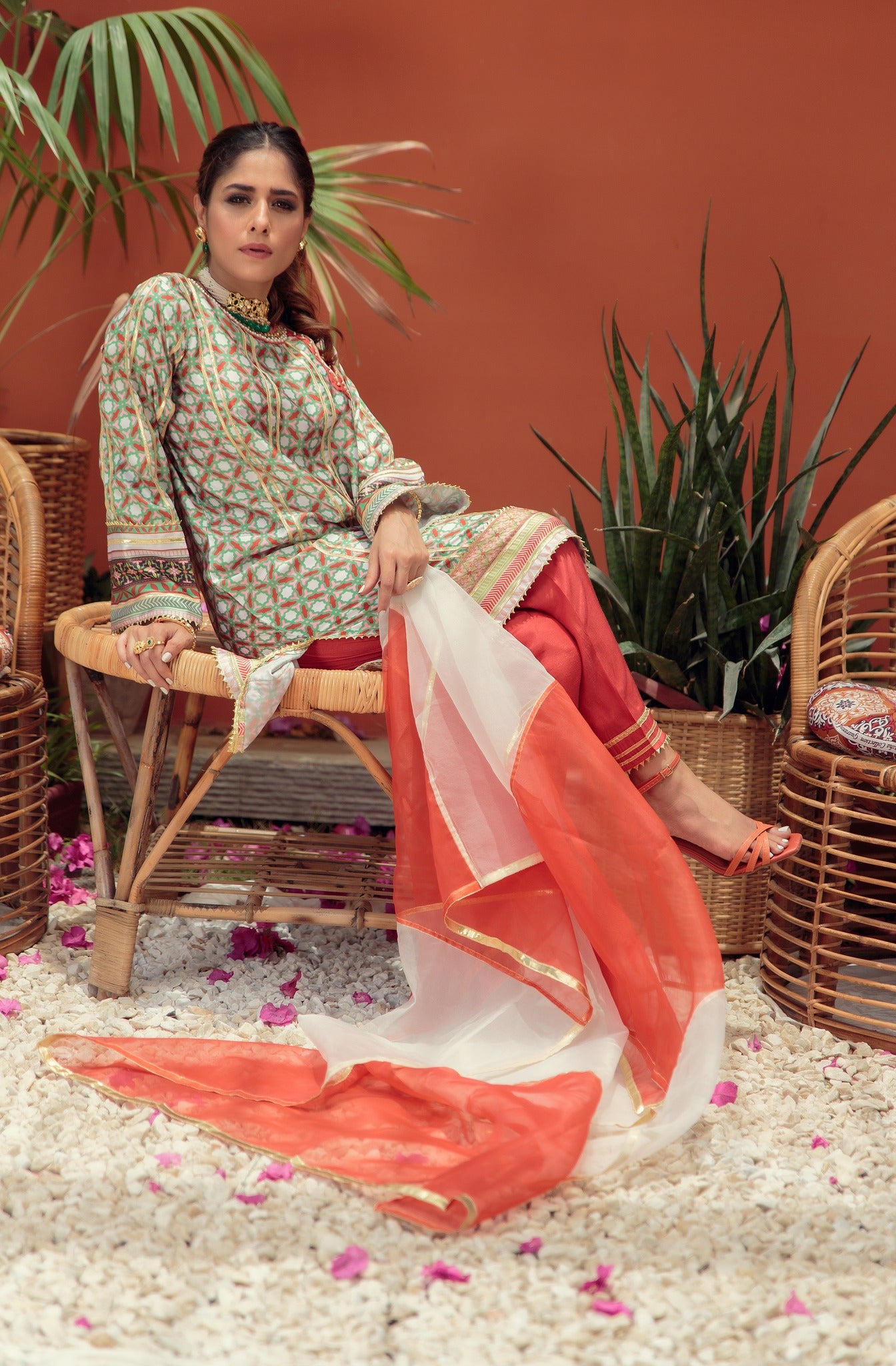 The relaxed, much loved silhouette has a universally flattering neckline, adorned with delicate hand-embroidered neck line. Its paired with a cotton silk shalwar with gota (as pictured) and an organza dupatta to effortlessly steal the show.