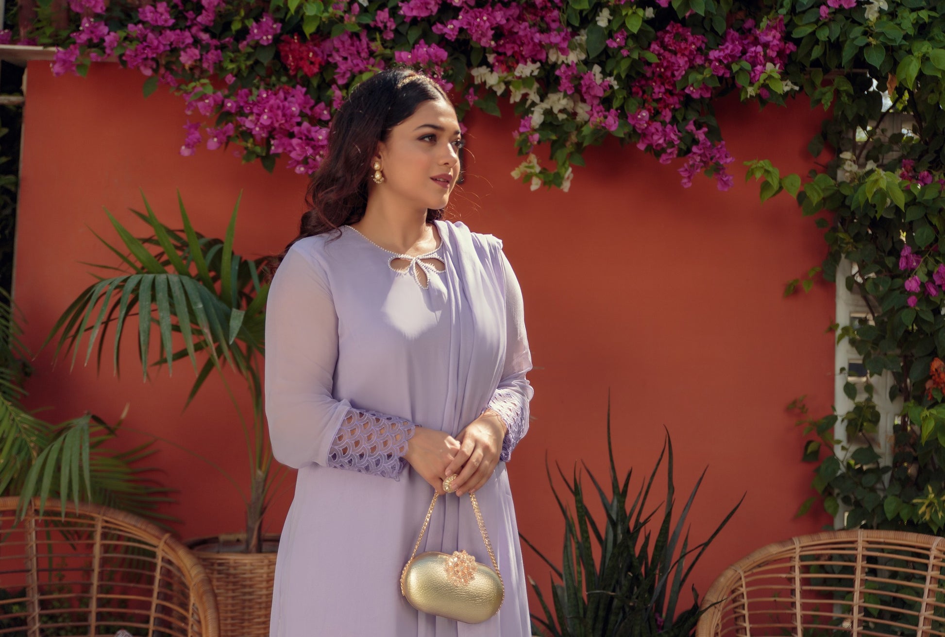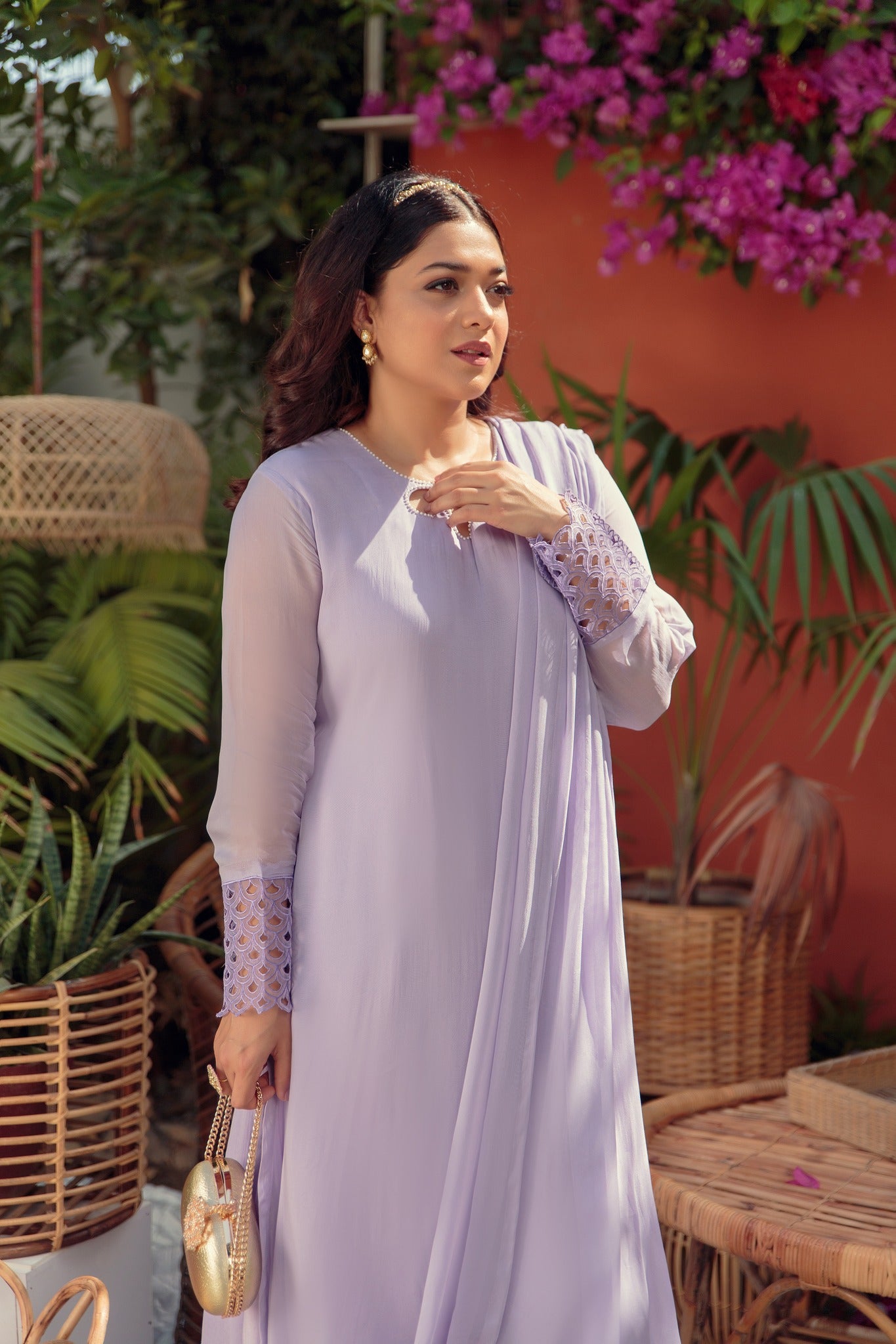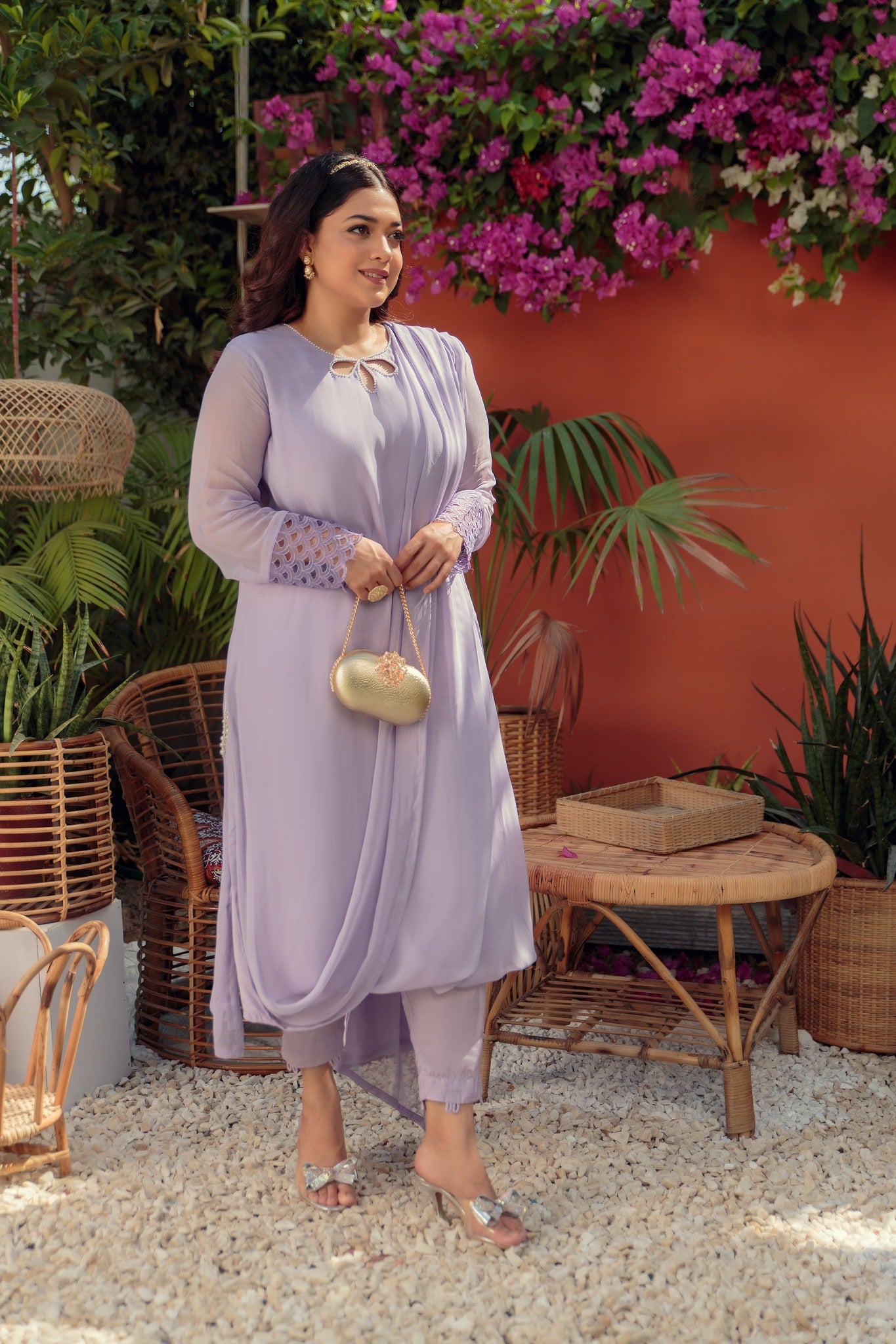 In true signature Anum Jung style, long embellished georgette shirt in lavender features a stunning drape attached from border. Pair your outfit with plain straight pants with loops.