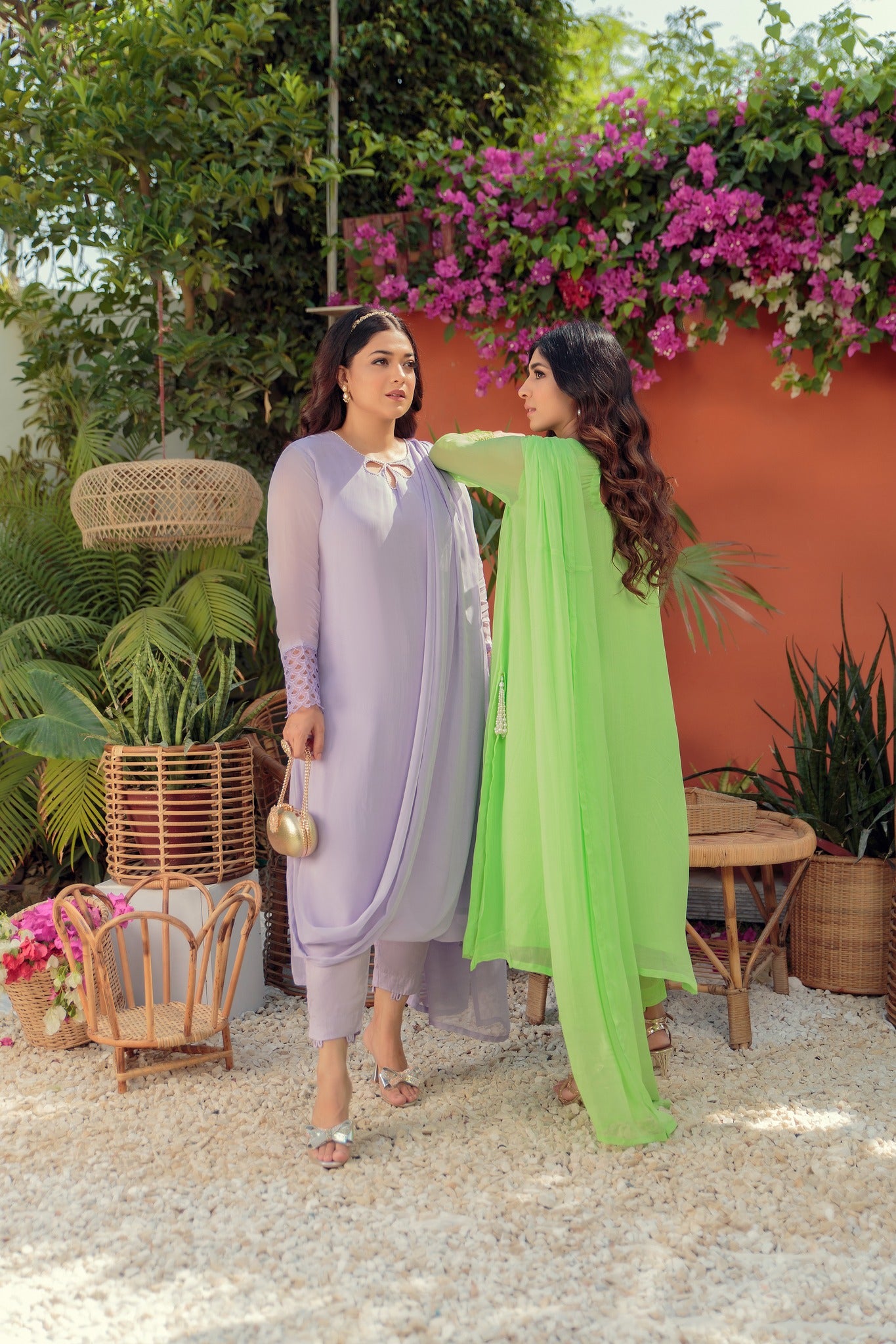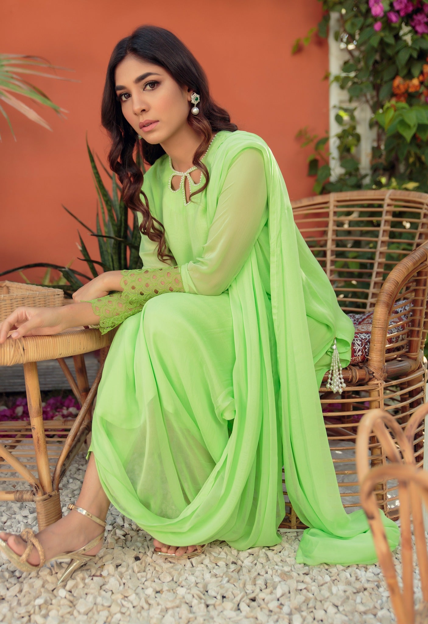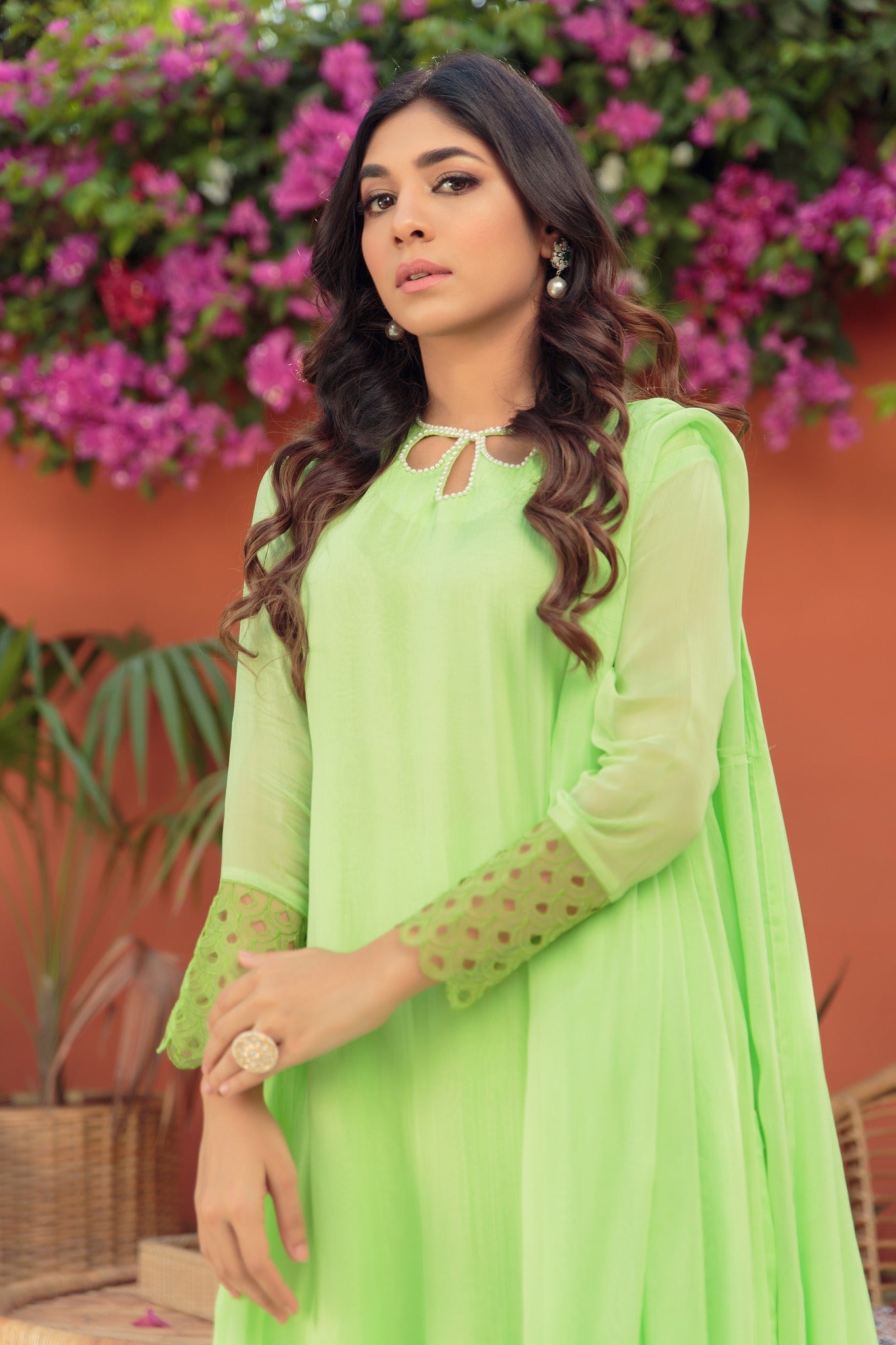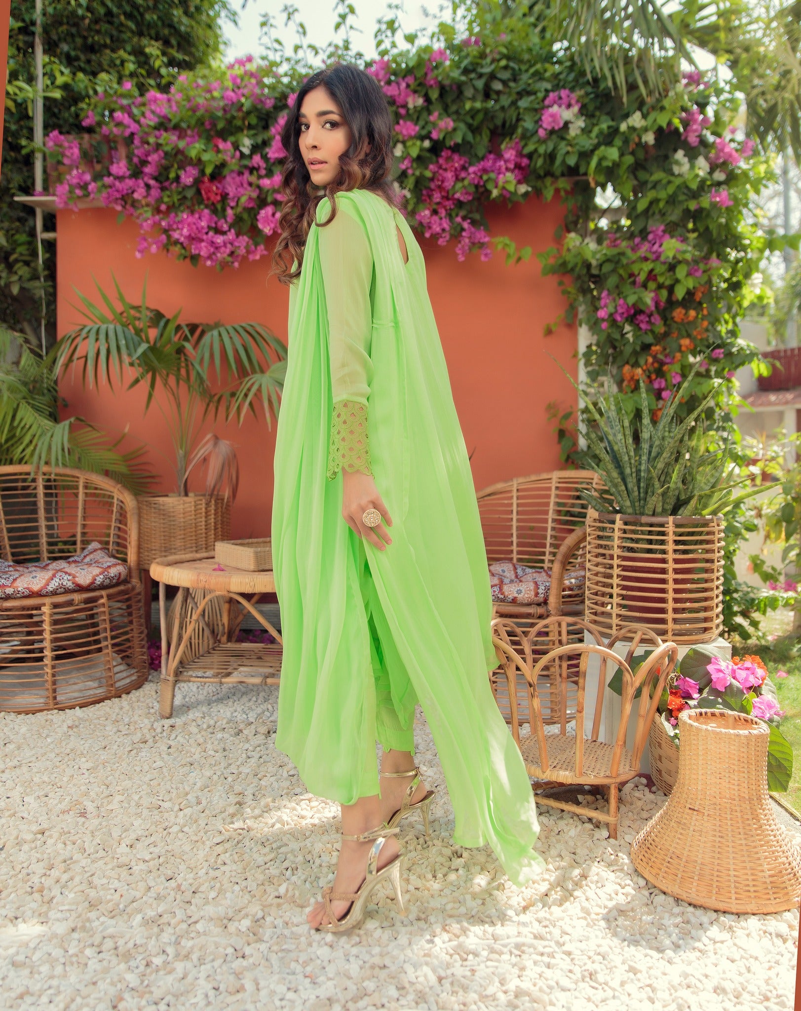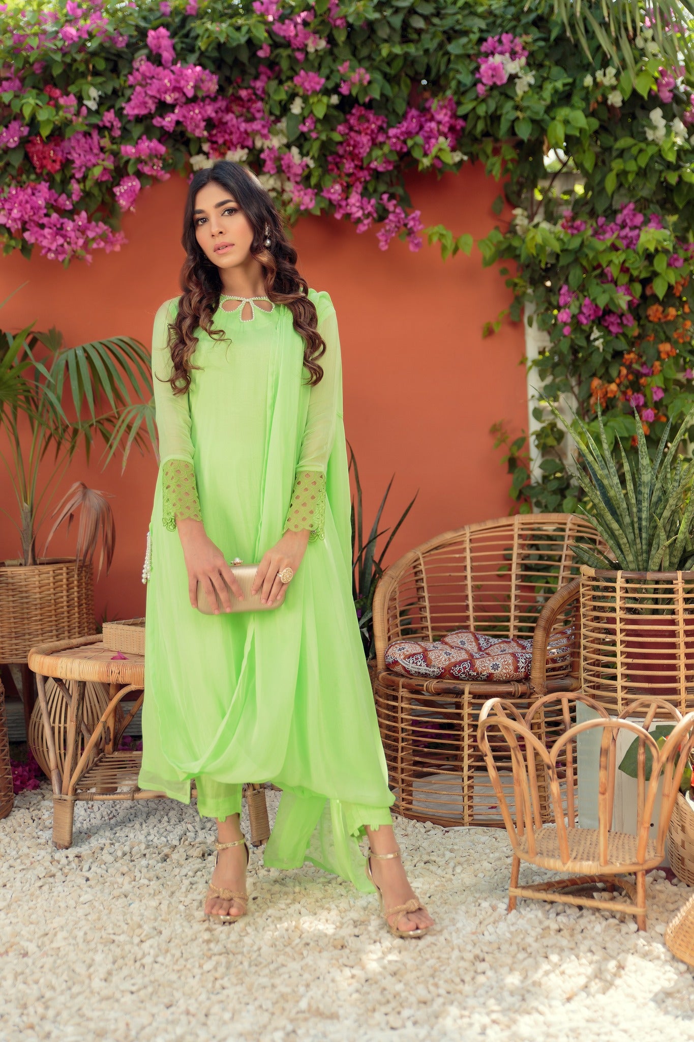 In true signature Anum Jung style, long embellished georgette shirt in neon green features a stunning drape attached from border. Pair your outfit with plain straight pants with loops.