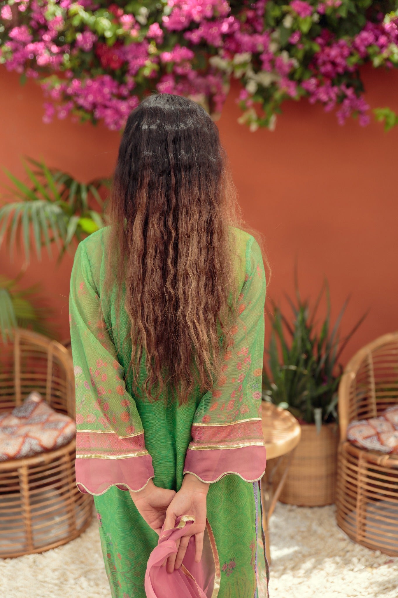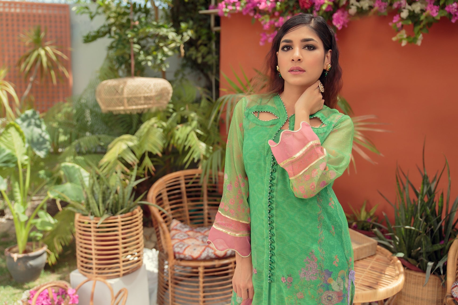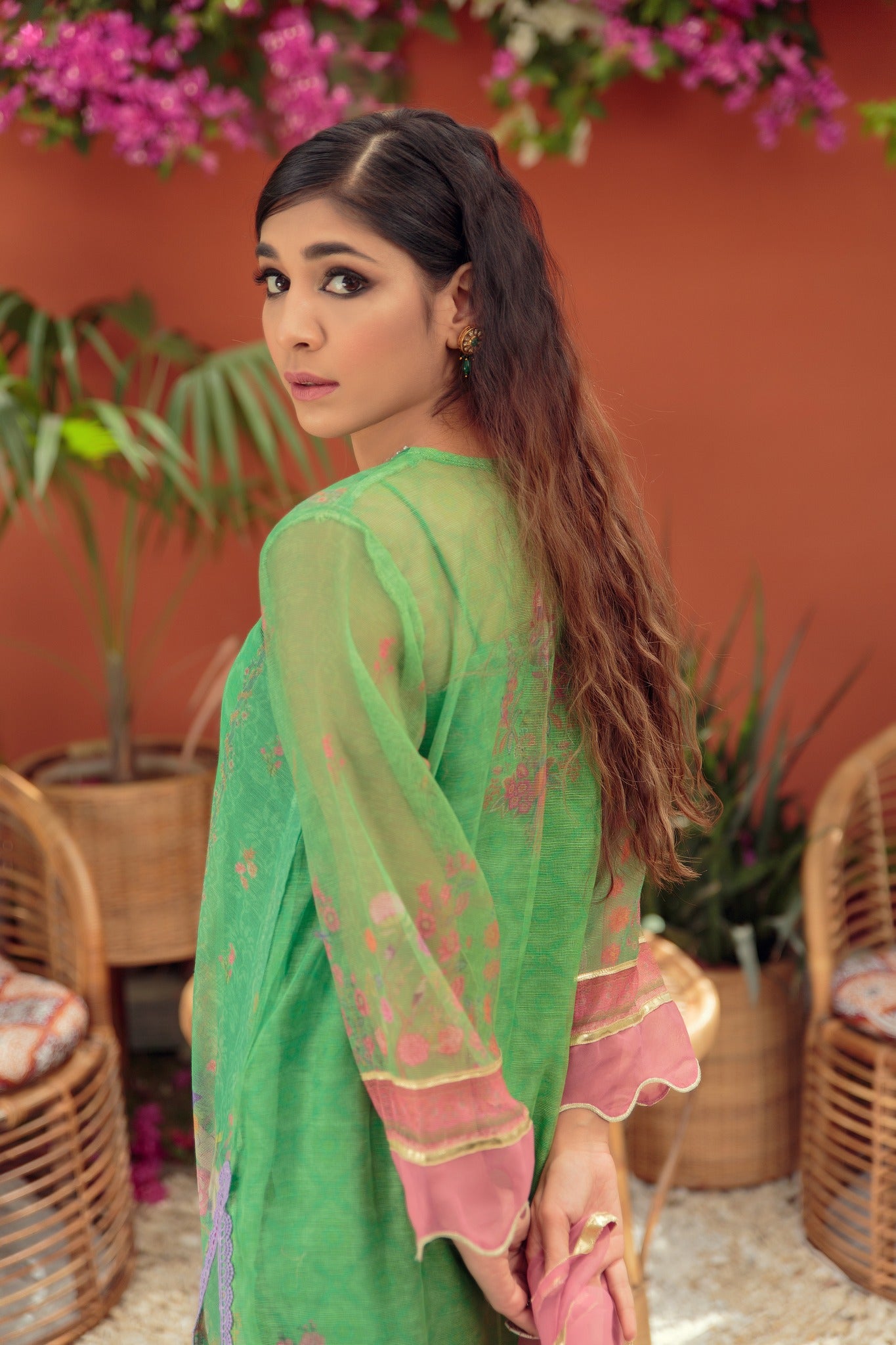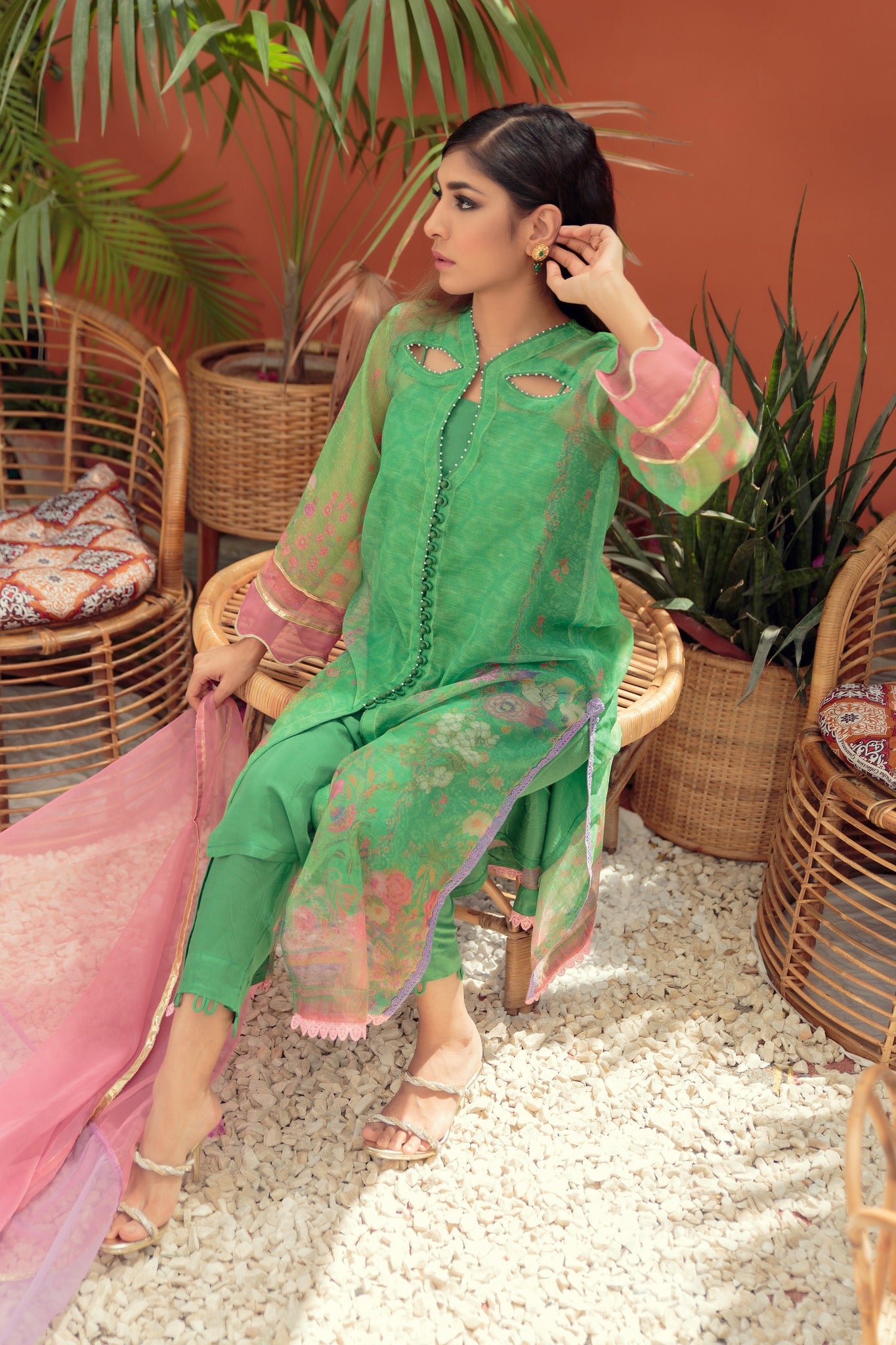 This cotton net shirt in a green shade features a floral print and is embellished with pearls on the neckline. This timeless garment is complimented by straight pants with loops detailing and paired with embellished organza dupatta with gota.