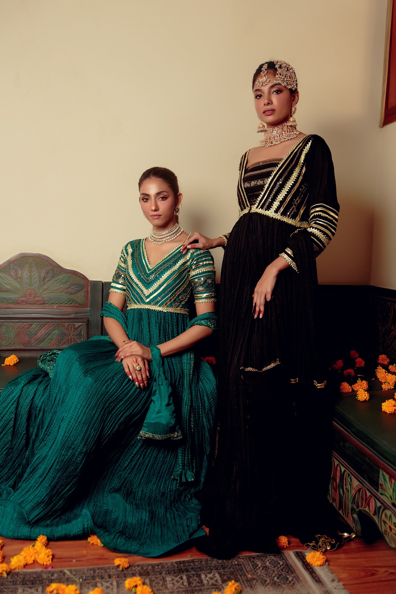 The AJ Signature collection embodies the epitome of bridal opulence, presenting the remarkable Crushed Peshwas embellished with detailed gota, threadwork, and Zari embroidery. This outfit is perfectly enhanced by a crushed block printed dupatta and an exquisite handbag, adding to its stunning allure.